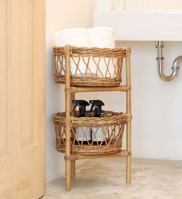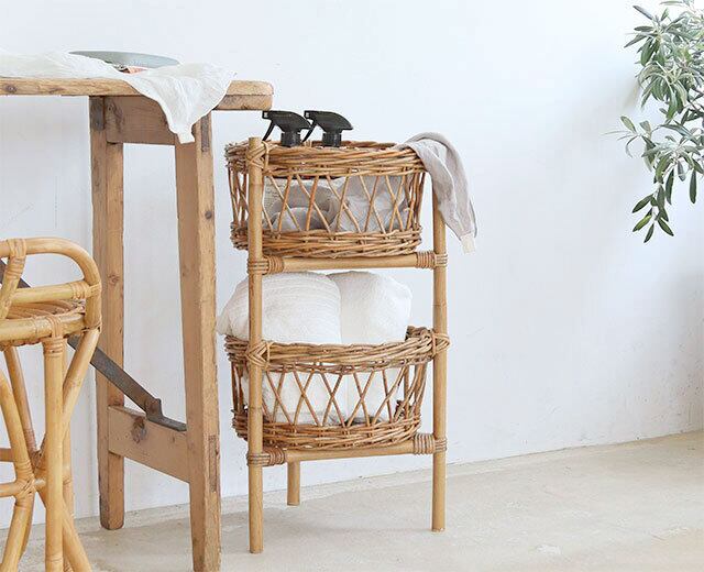 ヨーロッパのアンティークデザインを思わせる風合い豊かな皮つきラタンの2段バスケット 。